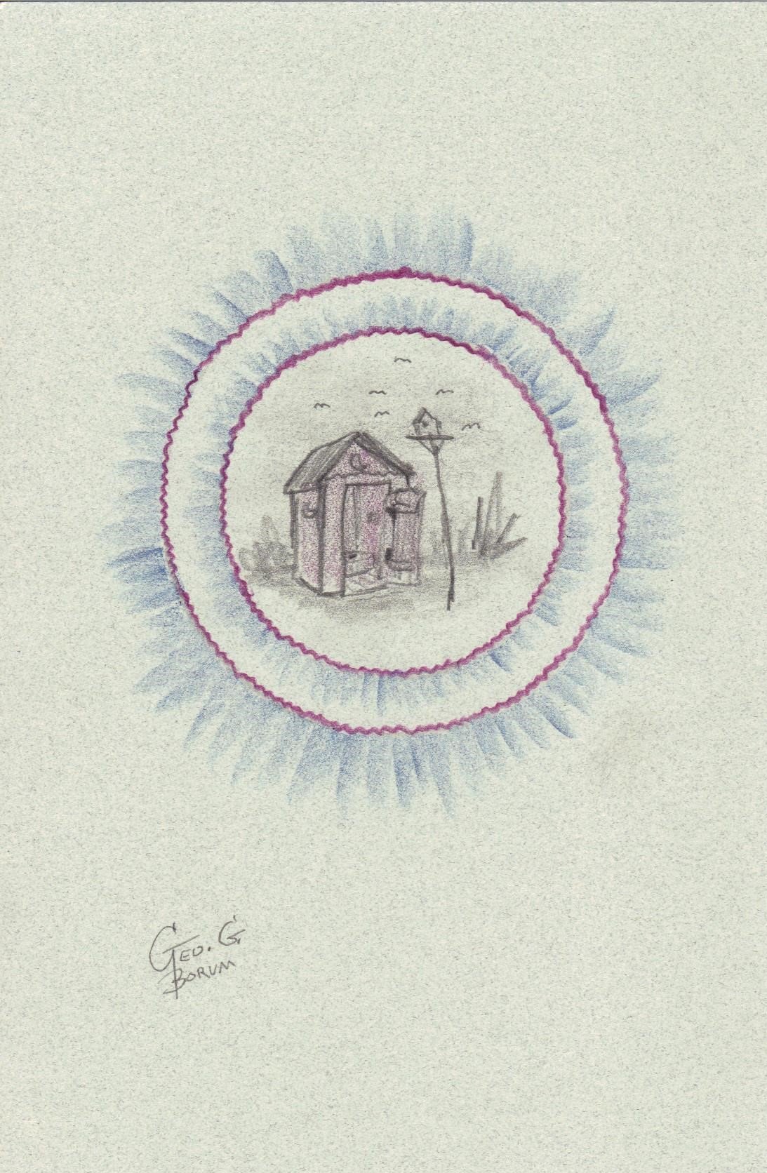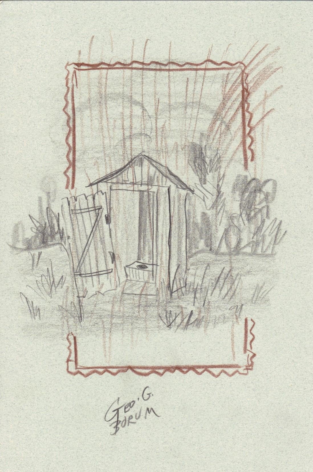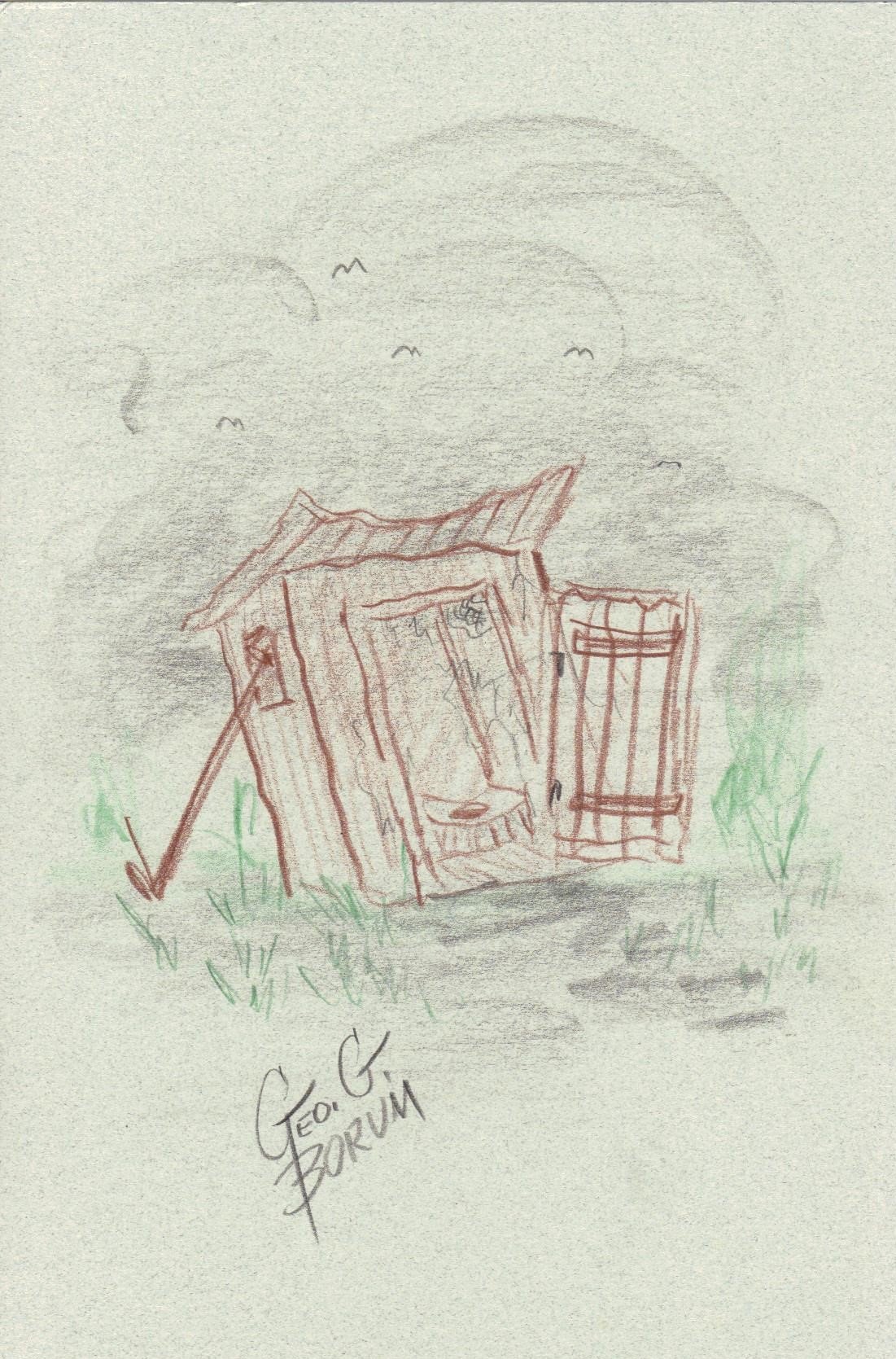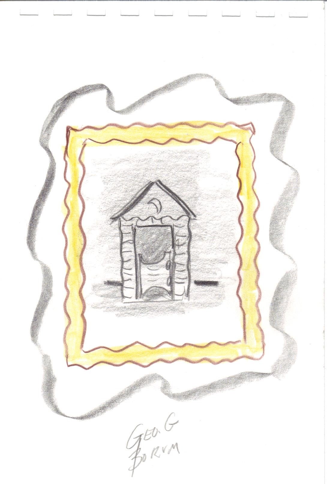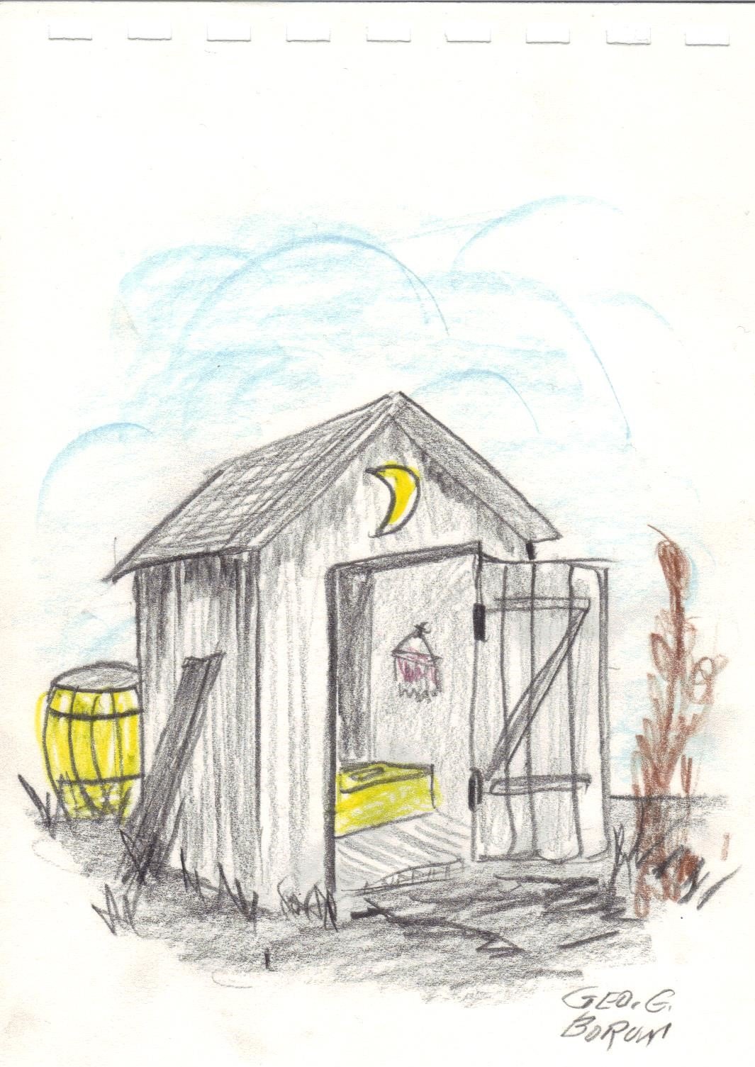 This is an original Outhouse sketch created by George Borum. He lived in Illinois and was a sign painter, calligrapher, auctioneer, carver, and a tramp art artist to name a few. He passed away in 2012 and is now entertaining a whole lot of people in heaven.